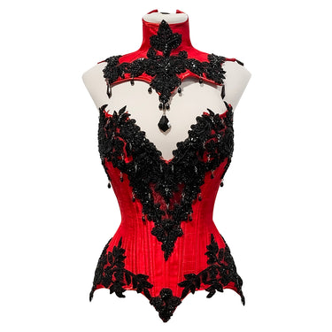 Handmade hourglass silk corset with premium black rebrodè appliquès and ornamental glass beads PLUS matching neck corset.