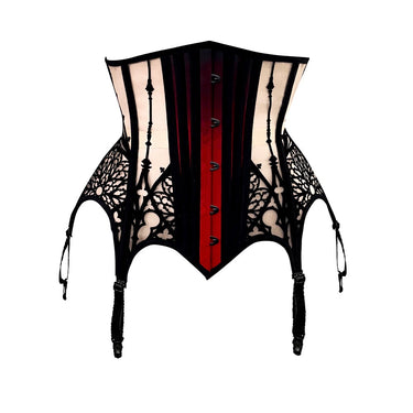This underbust features nude waist tape, black boning channels, inner steel boning combination (spiral and flat). Rear black eyelets and satin ribbon fastening.