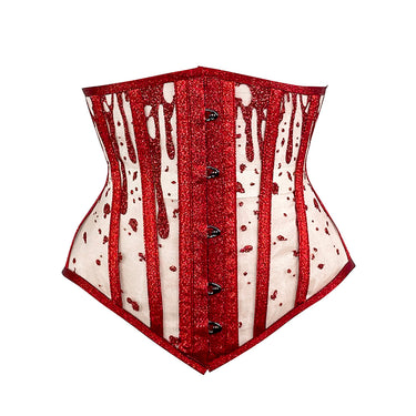 Handmade see-through mesh underbust, embellished with a dramatic scarlet glitter “blood drip” motif.