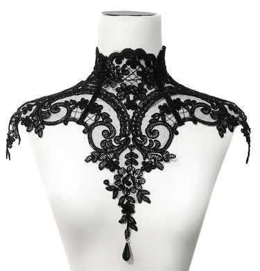 Handmade Neckpiece in rebrodè Lace. Corset fastening with eyelets and ribbons. Central acrylic ornamental droplet.