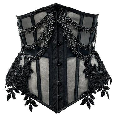 Handmade mesh underbust with cascading ornaments for a simulated rib cage look and premium lace floral appliqués.