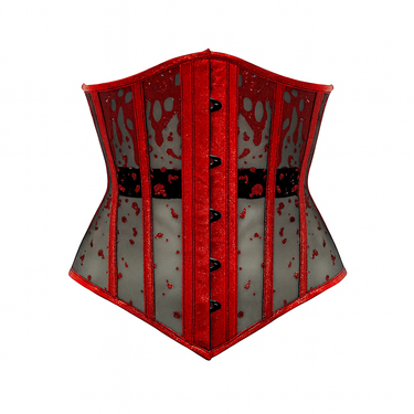 This underbust features black waist tape, red boning channels, inner steel boning combination (spiral and flat). Rear black eyelets and satin ribbon fastening.