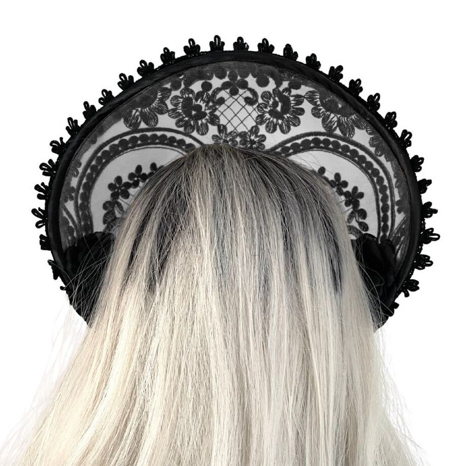 A dramatic kokoshnik headpiece crafted in refined black rebrodé lace, sculpted into a bold arched silhouette that frames the head with striking gothic elegance. The intricate floral lacework creates a rich, dimensional texture against the sheer base, allowing light to pass through while maintaining a strong visual presence.
