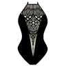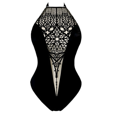 This high-neck bodysuit combines cathedral-inspired with a bold, sculptural silhouette. The front features a deep V illusion in sheer eco-friendly nude mesh, richly printed with black velvet-effect cathedral motifs. Side panels and lower body are made of ultra-soft vegan satin for a sleek, body-contouring finish.