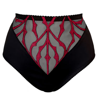 These high-waisted briefs are crafted from sheer black mesh, richly embroidered with our signature gothic motif in deep burgundy thread. The sides and lower panels are made from smooth black vegan satin, creating a refined contrast while offering comfortable, sculpting coverage.