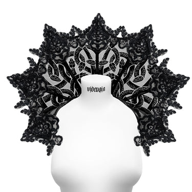 Sturdy mesh base with velvet snakes details and overlapping lace decorations.