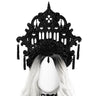 Decorated with black lace and black roses, the headpiece evokes the atmosphere of a forgotten chapel — delicate, decadent, and unmistakably gothic.