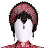 A dramatic kokoshnik headpiece crafted in refined burgundy dogma lace, sculpted into a bold arched silhouette that frames the head with striking gothic elegance.