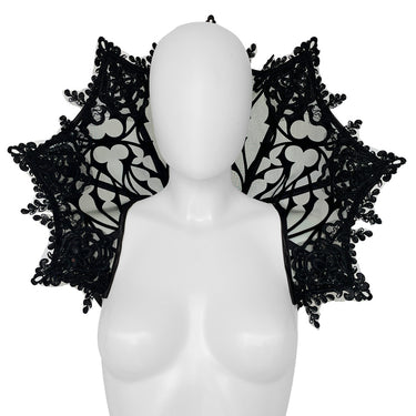 Sturdy mesh base with velvet cathedral details and overlapping lace decorations.