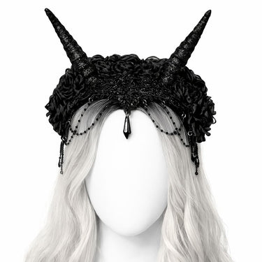 Rigid horned crown handcrafted with sculptural plastic horns, coated in black glitter for an intense, light-catching finish.
