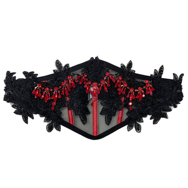 Handmade black mesh belt with intricate hand-stitched black lace appliqués and cascading rows of red glass beads.