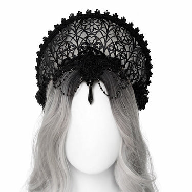 Cathedral-inspired kokoshnik headpiece crafted on a sheer black mesh base, richly embroidered with gothic stained-glass motifs. The design is adorned with sculptural black roses and refined beaded decorations, creating depth, texture, and a dramatic yet elegant silhouette.