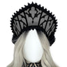 Cathedral-inspired kokoshnik headpiece, crafted on a sheer nude mesh foundation and richly embroidered with gothic stained-glass motifs, evoking the tracery and symmetry of sacred architecture. Sculptural black roses and refined beaded embellishments emerge from the surface like carved ornamentation, creating depth, texture, and a solemn, icon-like presence.