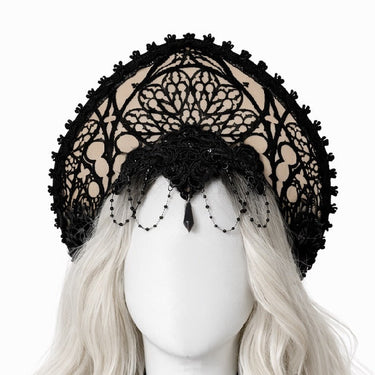 Cathedral-inspired kokoshnik headpiece, crafted on a sheer black mesh foundation and richly embroidered with gothic stained-glass motifs, evoking the tracery and symmetry of sacred architecture. Sculptural black roses and refined beaded embellishments emerge from the surface like carved ornamentation, creating depth, texture, and a solemn, icon-like presence.