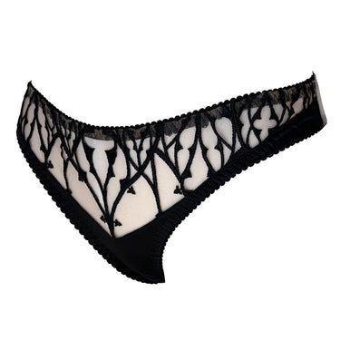 A timeless silhouette infused with gothic seduction. This mid-rise brief from the Dogma collection is crafted from sheer nude mesh and adorned with deep black, velvet-effect embroidery inspired by the soaring arches and stained glass tracery of gothic cathedrals — a Videnoir signature.