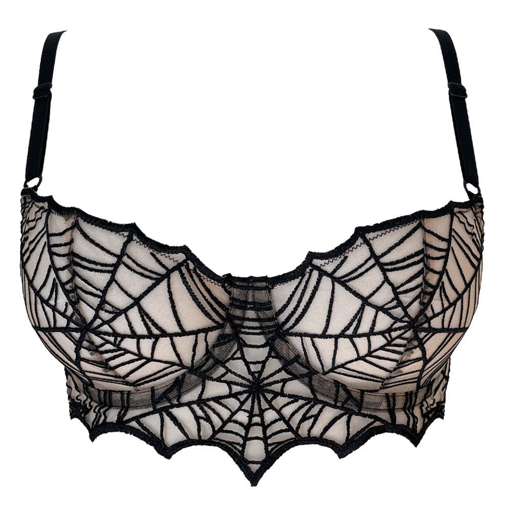 Pointed vampire-inspired edges, now reimagined with intricate spiderweb black embroidery on eco-friendly nude mesh — replacing our previous velvet-flock version for a more durable and elevated finish.