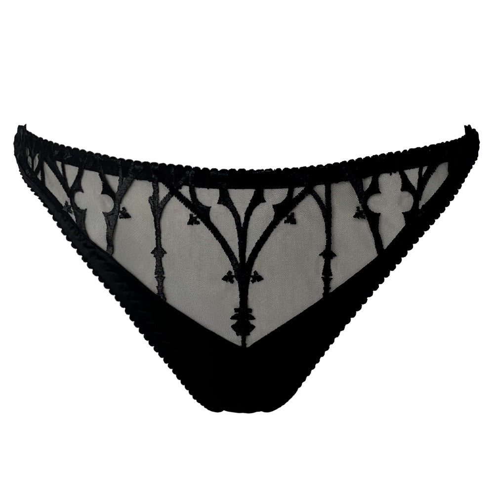 This adjustable tanga is crafted from sheer black illusion mesh and adorned with deep black velvet-effect embroidery inspired by the soaring arches and stained glass tracery of gothic cathedrals — a true Videnoir signature.
