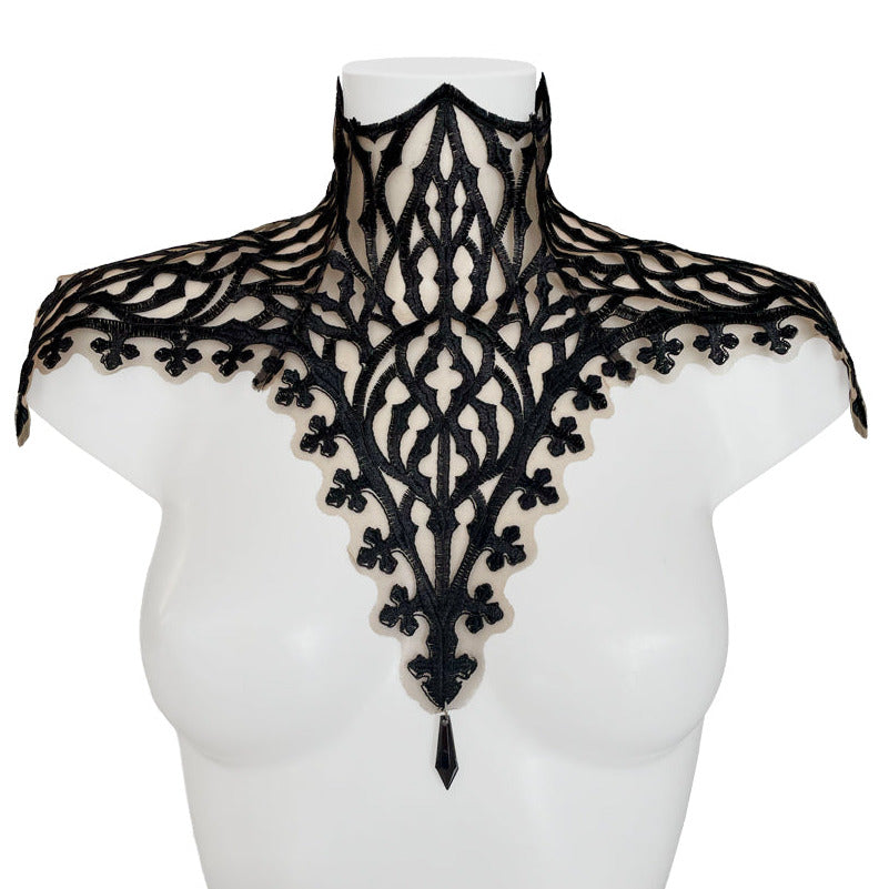 Handmade Neckpiece in custom cathedral rebrodè black lace on nude tulle. Corset fastening with eyelets and ribbons to optimize the fit. Central acrylic ornamental droplet.