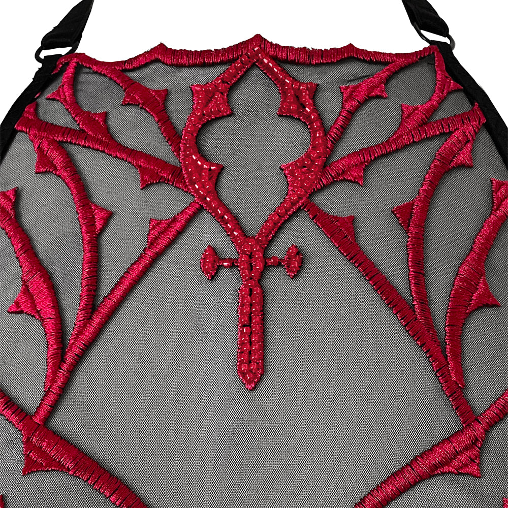 Dogma is a halter-style bra crafted from sheer black mesh, richly embroidered with our iconic cathedral-inspired motif in deep burgundy thread. The embroidery framing the neckline features a subtle, jewel-like effect that enhances the gothic elegance of the design.