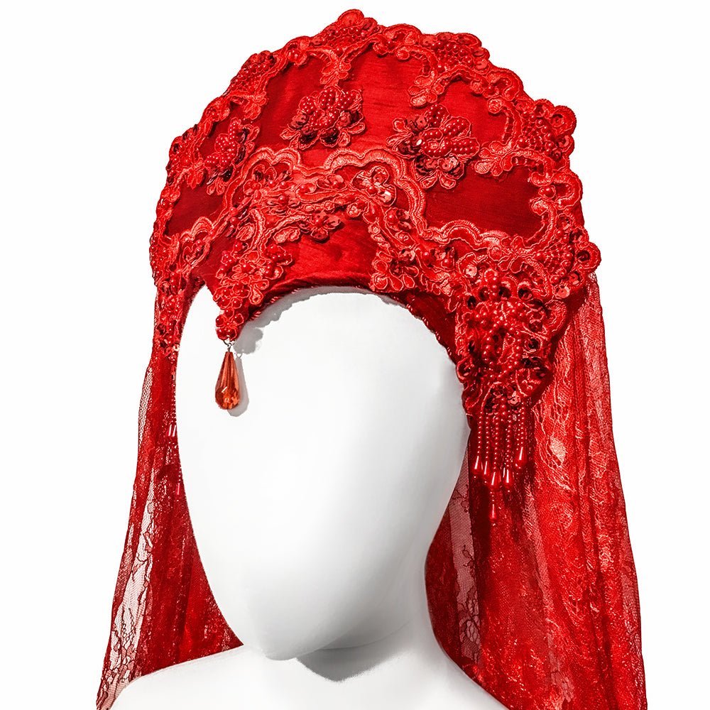 Velvet lined french hood topped with beaded lace with additional decorative beads.