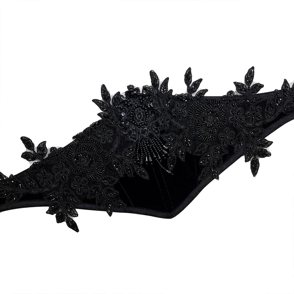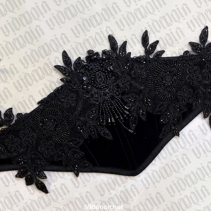 Custom fabric with inner metal boning and hand stitched black beaded appliquès.