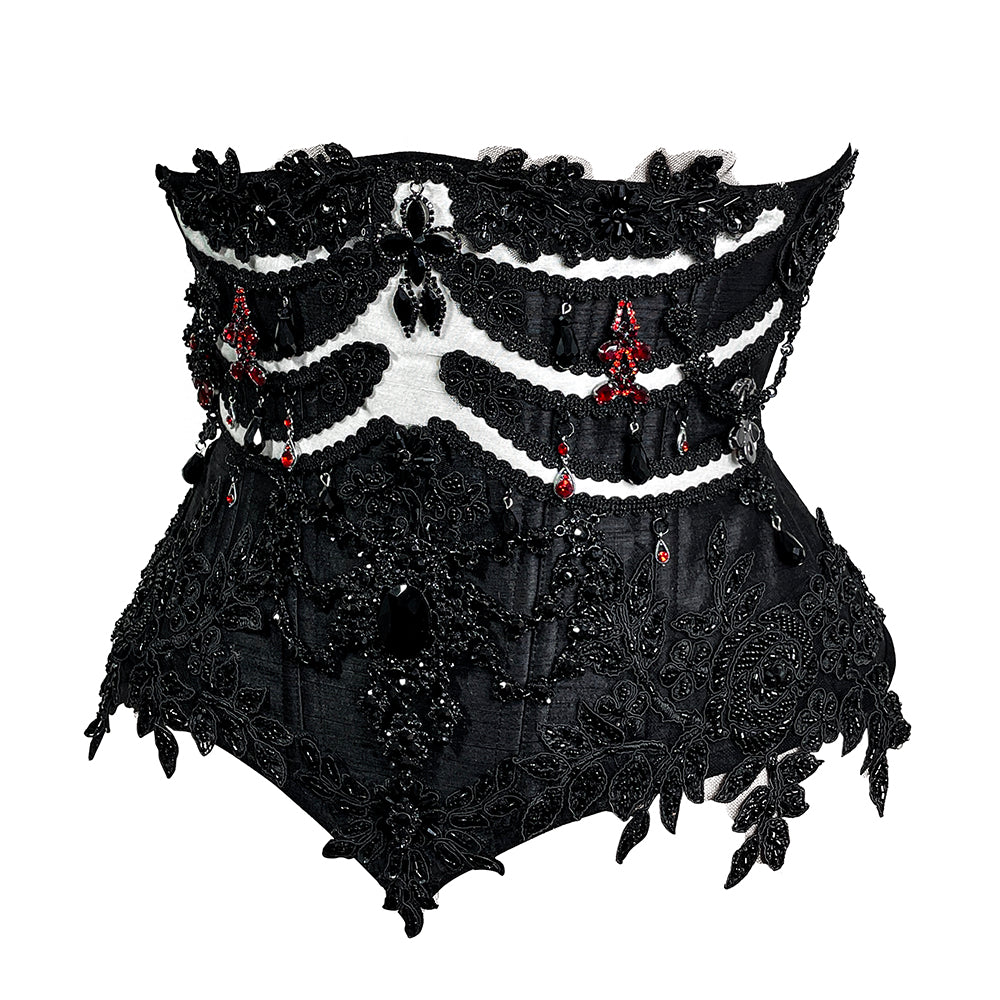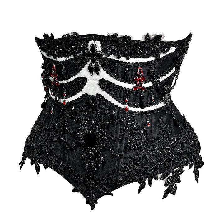 Hand-crafted 3D silk elements to mimic bones, steel boning (spiral and flat), inner cotton lining for added comfort. Rear satin ribbons fastening for a perfect fit.