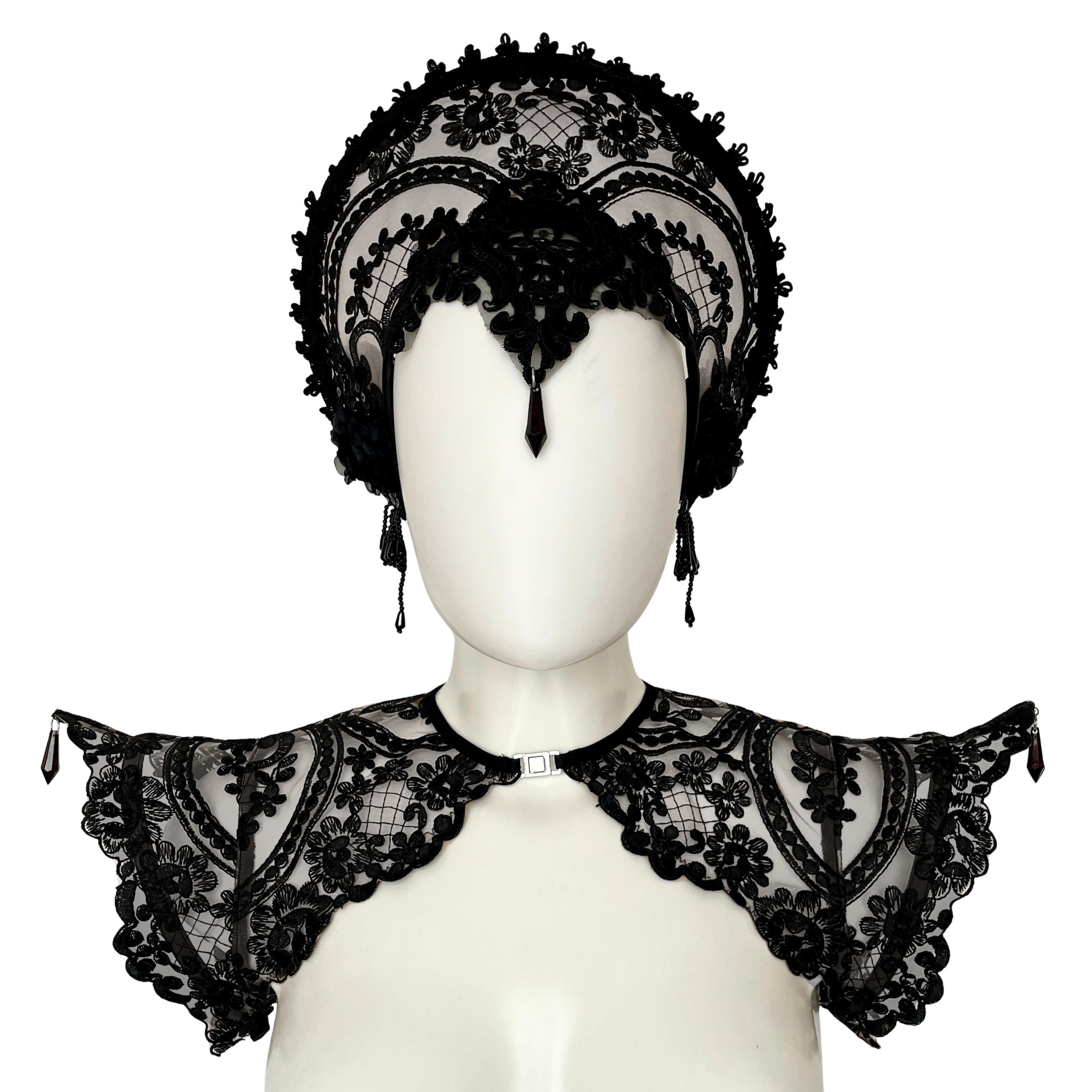 Handmade in Italy with custom floral embroidery on black mesh, this sculptural epaulette is reinforced with internal metal boning along the shoulder line to maintain its dramatic, elevated silhouette.