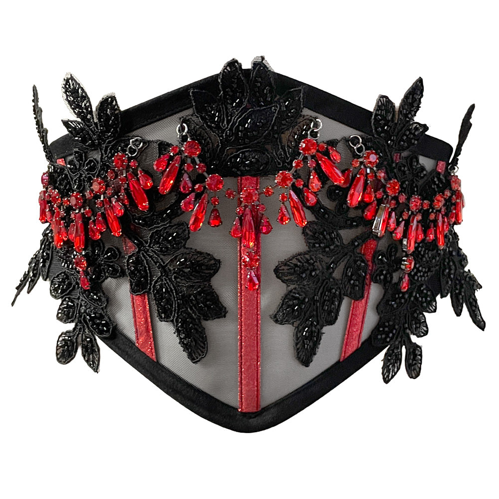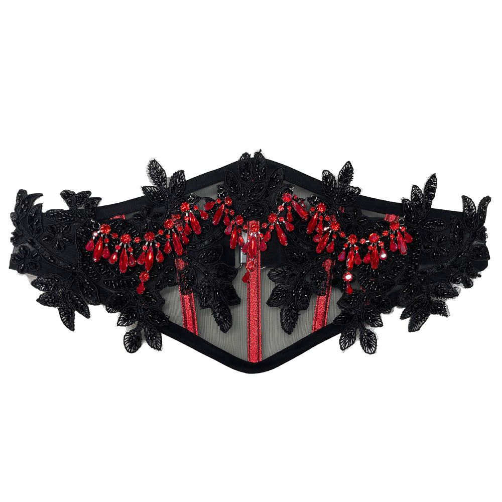 Handmade black mesh belt with intricate hand-stitched black lace appliqués and cascading rows of red glass beads.