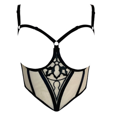 Designed to echo the gothic grandeur of the Sancta collection, this underbust harness blends sculptural design with delicate transparency. Made from sheer nude tulle, reinforced with eco mesh, it features bold appliquéd embroidery in deep black — a motif reminiscent of cathedral windows and sacred geometry.