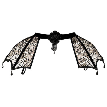 Handmade wired pannier with pointy vampire shape and custom velvet spiderweb mesh. Inner flexible boning for easy storage and transport.