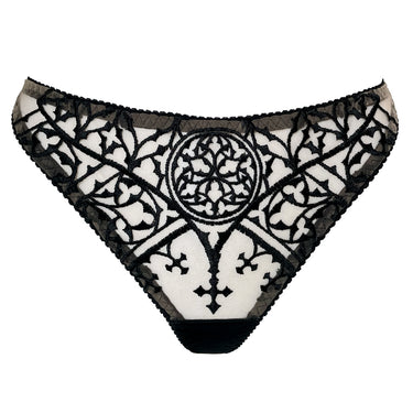 This mid-rise thong is crafted from smooth black satin and sheer nude mesh, embellished with unholy embroidery across the front.