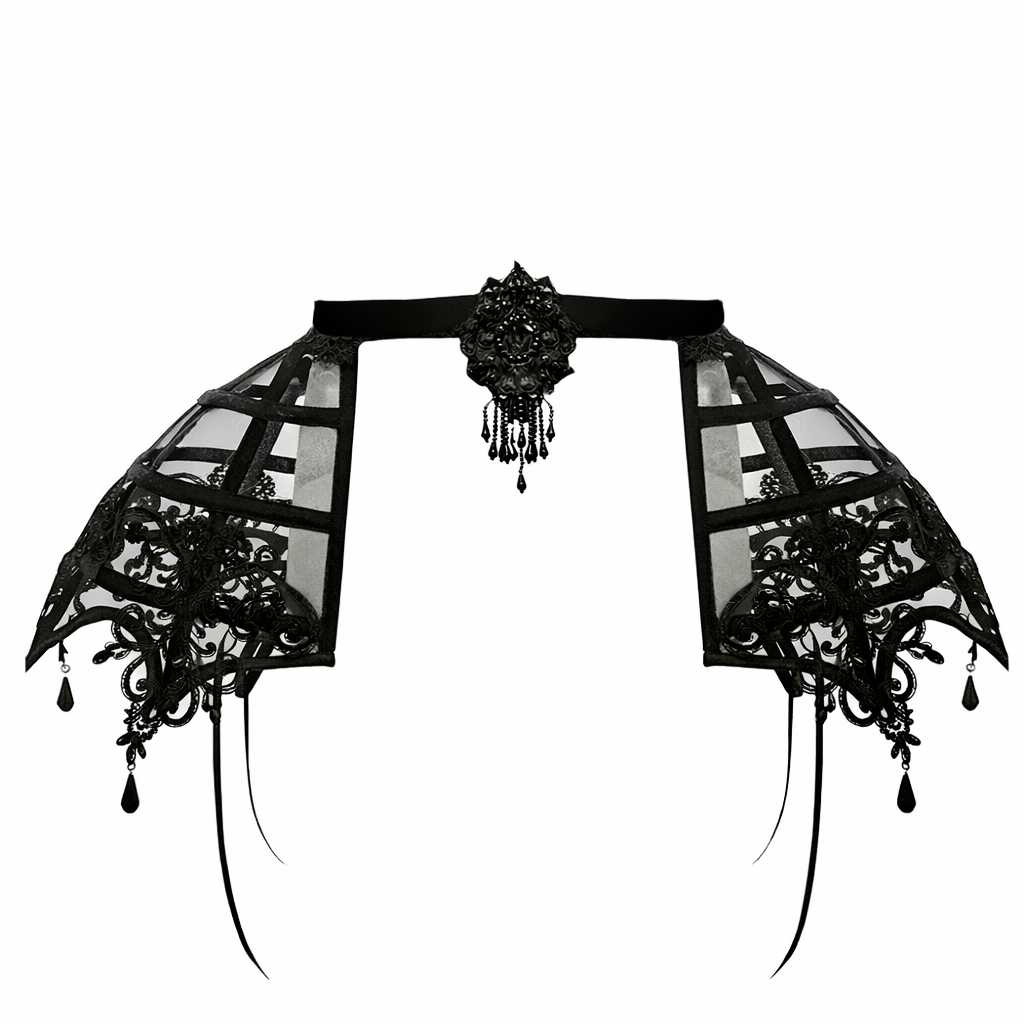The sturdy black mesh base is adorned with premium rebrodé lace, enriched with black glass beads and dangling teardrop gems for a dramatic, gothic finish. A refined central beaded waist embellishment adds depth and balance, while satin ribbon closures ensure adjustability and comfort.